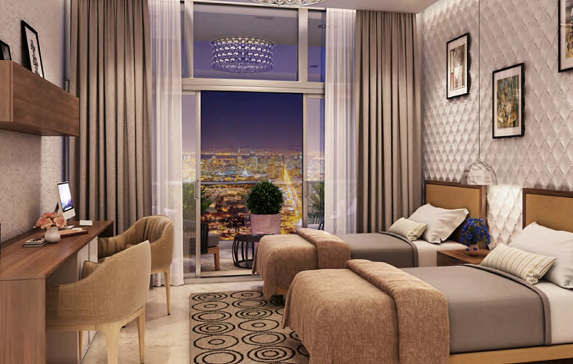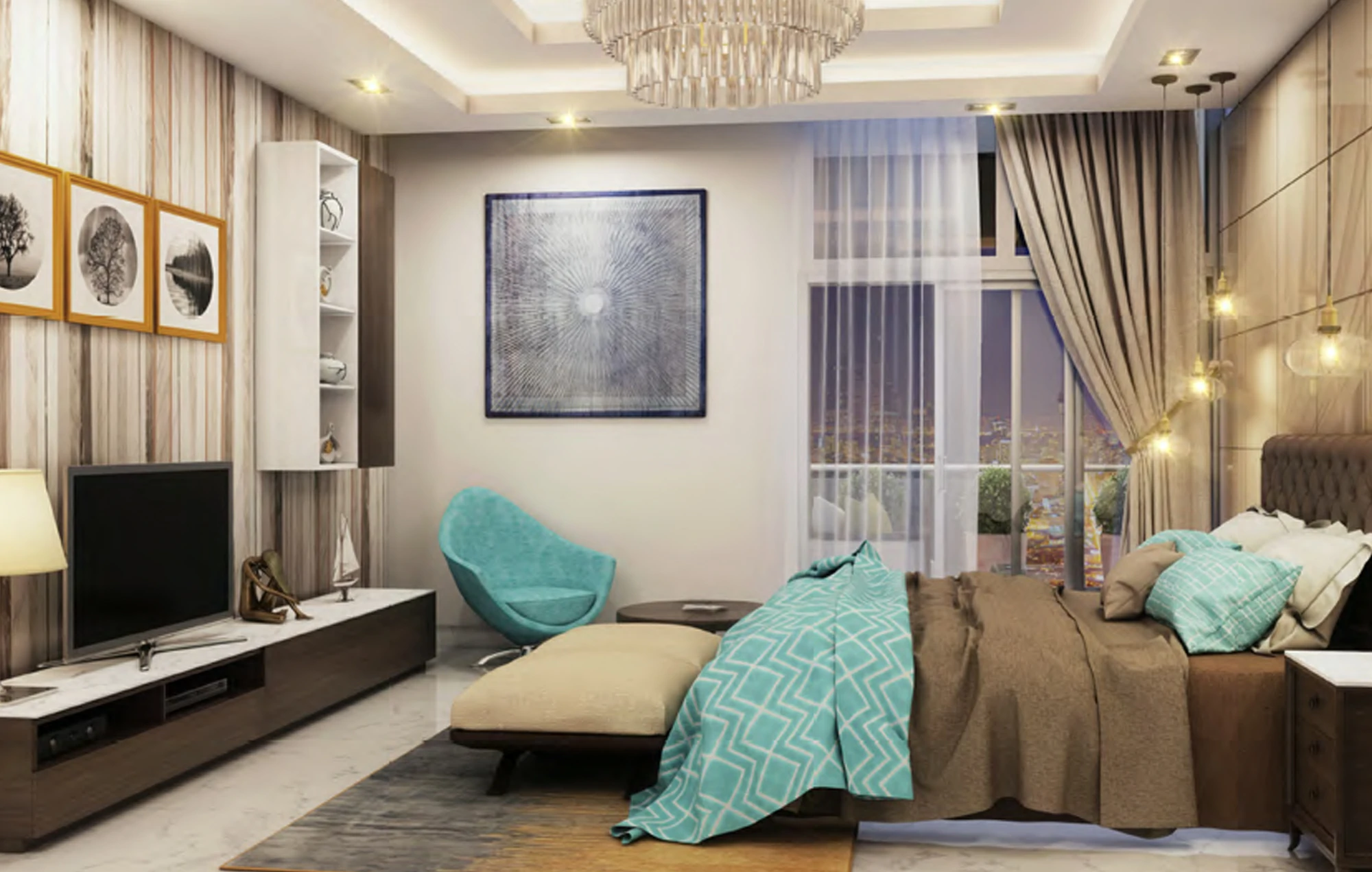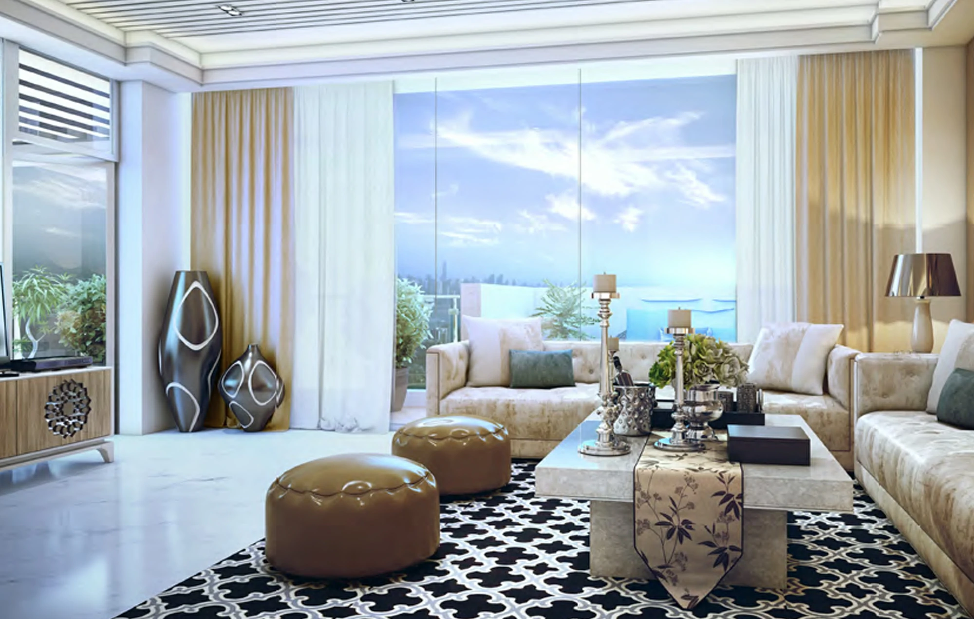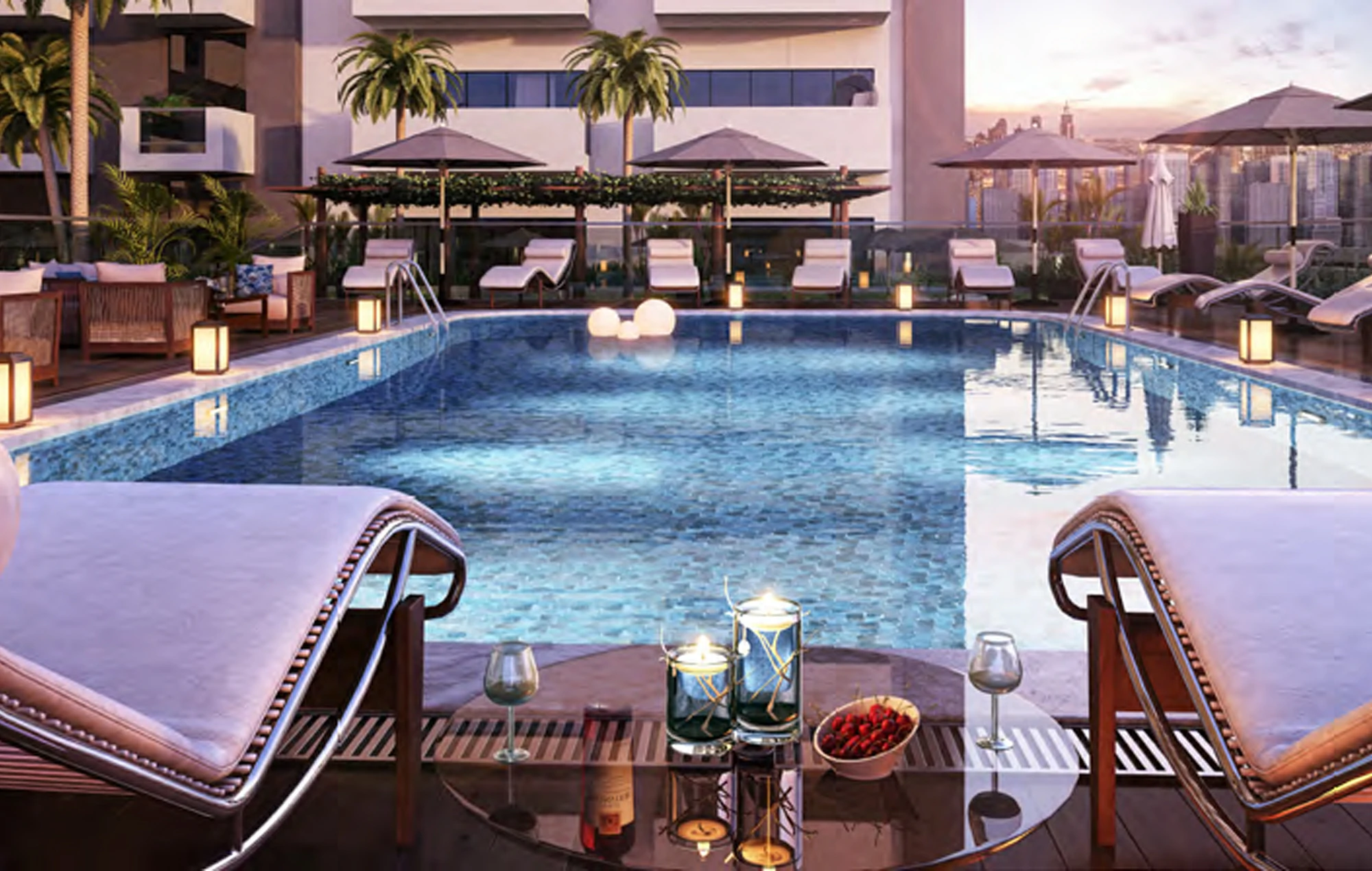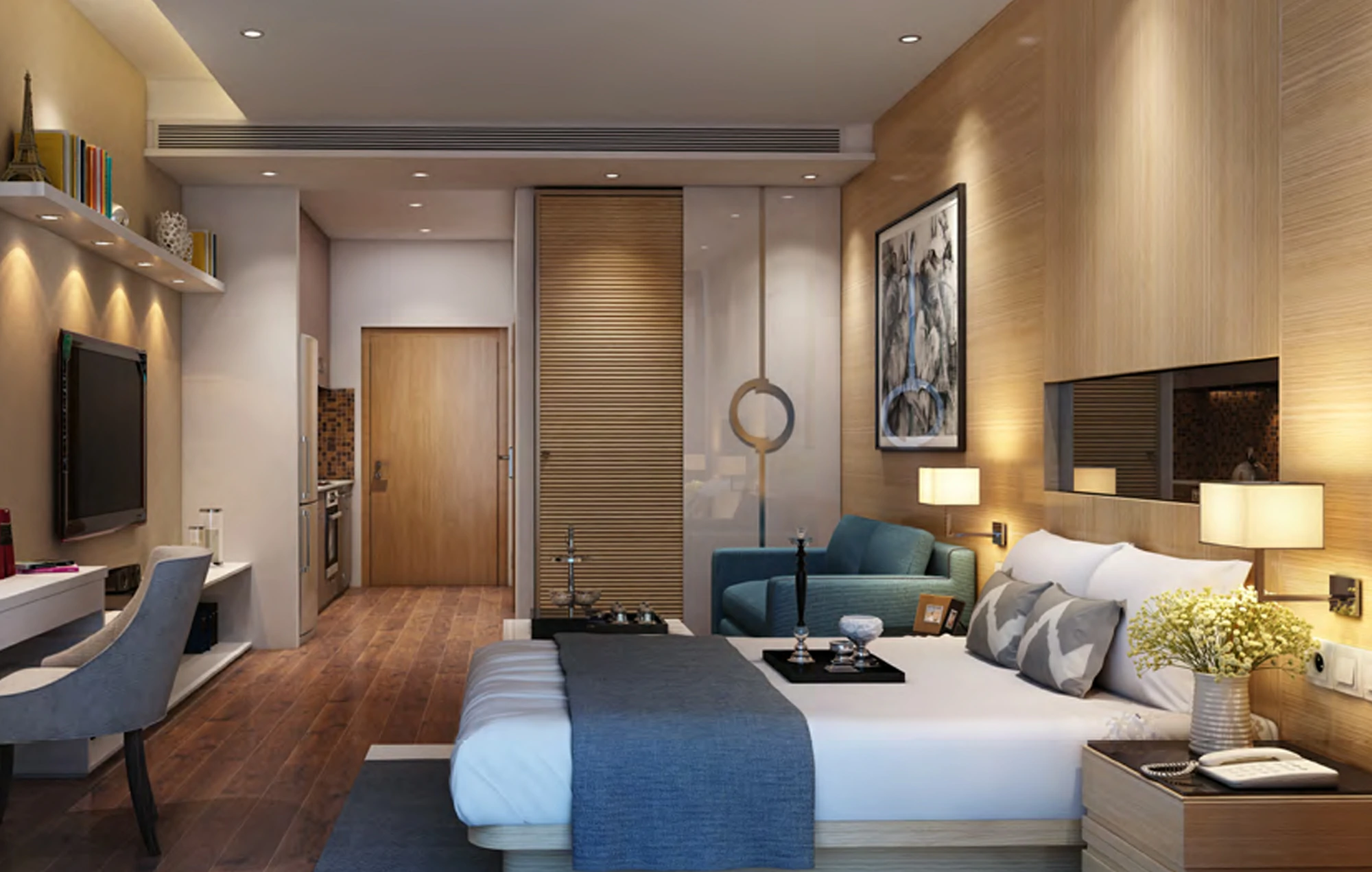A fully furnished 1-bedroom unit featuring modern finishes, open-plan kitchen, and balcony